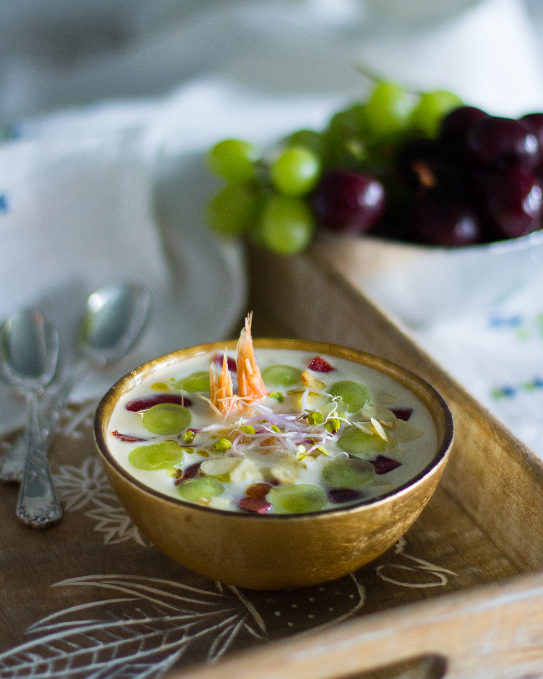 Si lo pongo de primer plato le añado varios toppings y siempre aprovechando lo que tengo en casa. Esta vez, al final de la receta te cuento que lleva este ajo blanco.