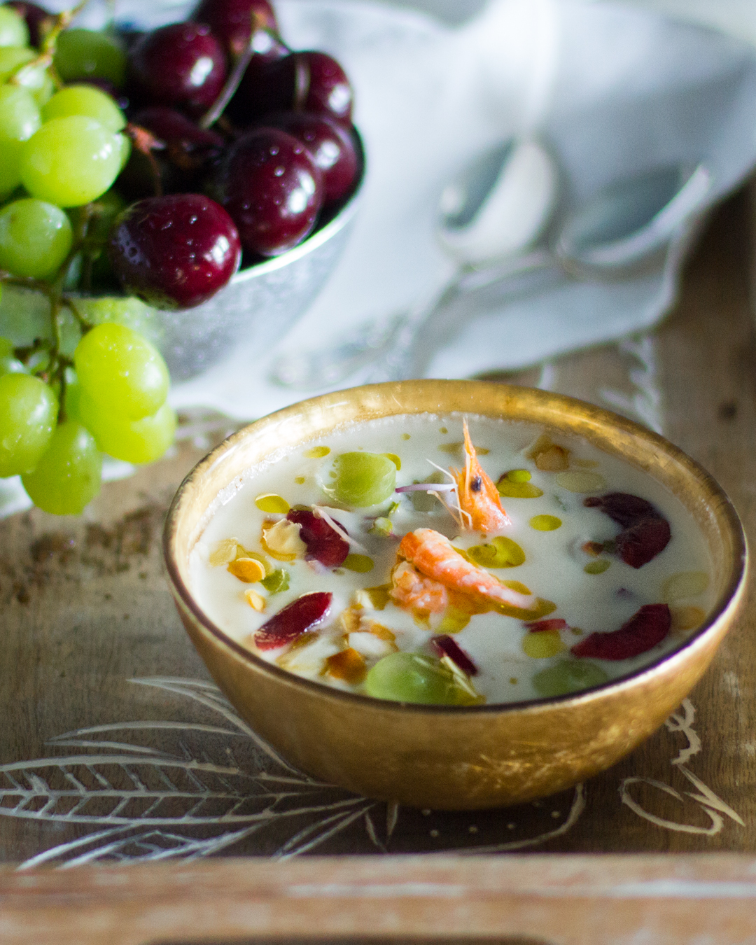 Si lo pongo de primer plato le añado varios toppings y siempre aprovechando lo que tengo, por ejemplo unas gambas cocidas, unas almendras tostadas, unas cerezas y uvas que he deshuesado y laminado con un cuchillo, unas gambas peladas excepto la cabeza que las pongo en alto para decorar y dar volumen, si tengo le pongo unos germinados y casi siempre termino echando unas gotas de aceite de oliva virgen extra.