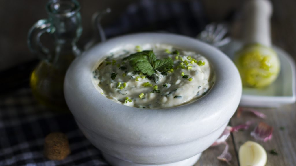 Como la receta tradicional de alioli conlleva mucho trabajo y el sabor es muy potente, la base de esta receta es un alioli al que añado una hierba aromática y mayonesa. Ideal para unas patatas bravas y con un trozo de pan está de escándalo.