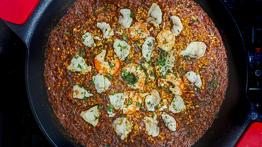 Cuando le faltan 3 minutos, añadimos el rape y los gambones y todos los líquidos que hayan soltado que esto es sabor.