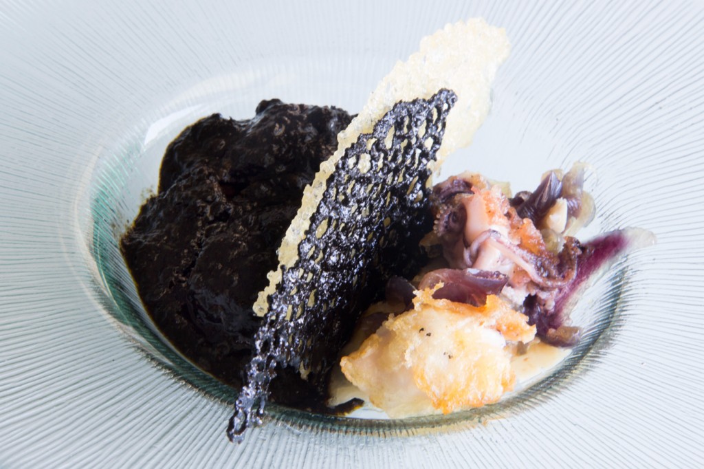 Para darle volumen al plato, rompemos el crujiente de pescado con la mano y lo colocamos en el medio al lado de los chipirones en su tinta. Hacemos lo mismo con el crujiente de tinta de calamar y lo ponemos en el medio junto a los chirriones encebollados.