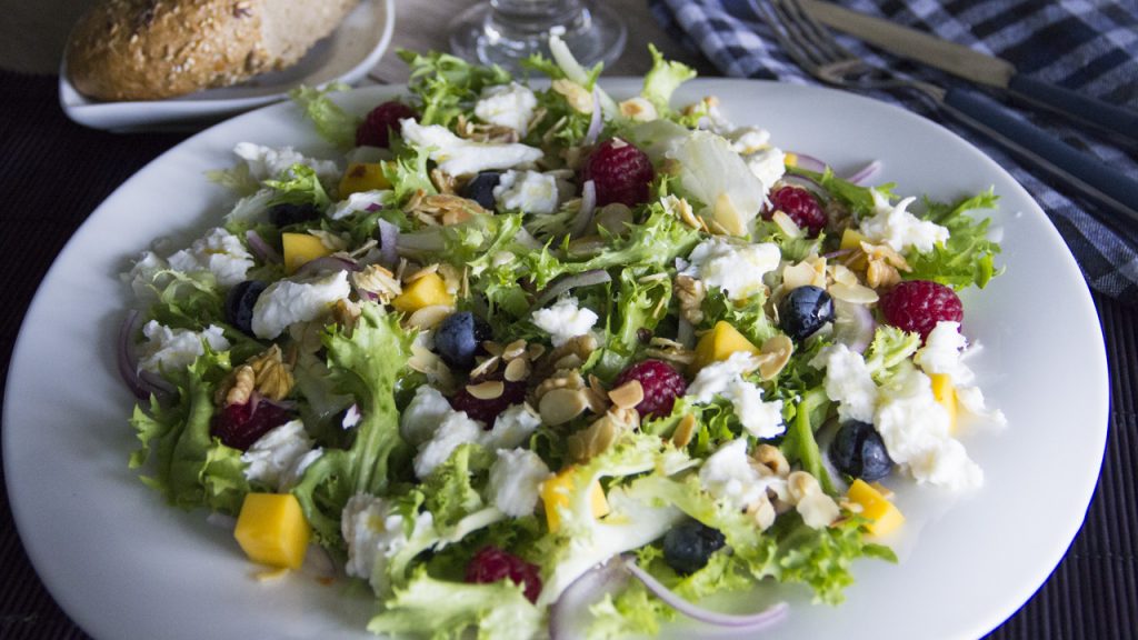 Una ensalada muy fresca llena de color, sabor y mucho contraste de texturas y sabores.