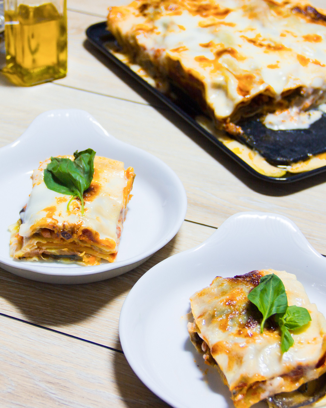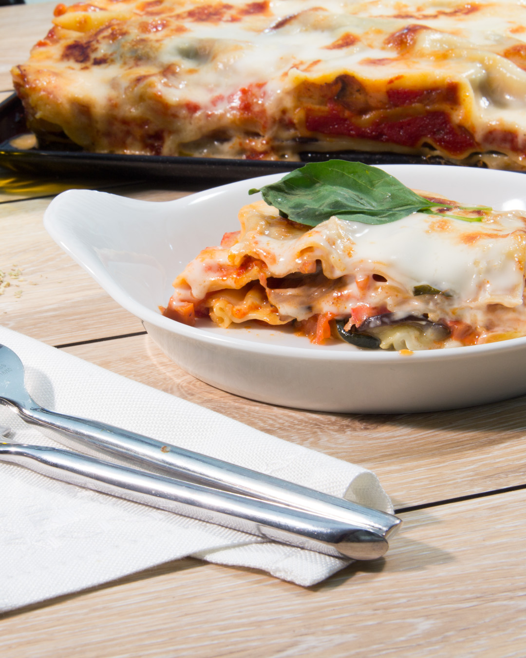 Primera capa: Cubrir la base con una capa fina de bechamel, encima disponer láminas de lasaña. Sobre ellas poner la berenjena, calabacín y el tomate natural en rodajas.