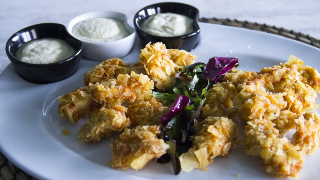 Para que queden crujientes los vamos a rebozar en patatas fritas pero no os asustéis, que también los podéis rebozar en avena o dejarlos sólo con la tempura al curry.