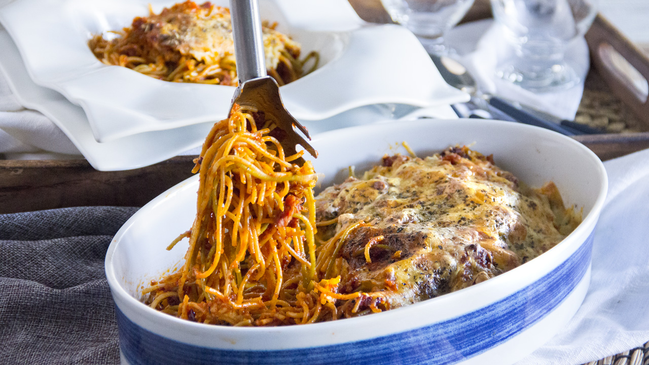 ESPAGUETIS SUPERVITAMINADOS, con verduras, tomate, chorizo y gratinados con queso. Seguramente, en mi casa tengan razón cuando dicen que tengo
