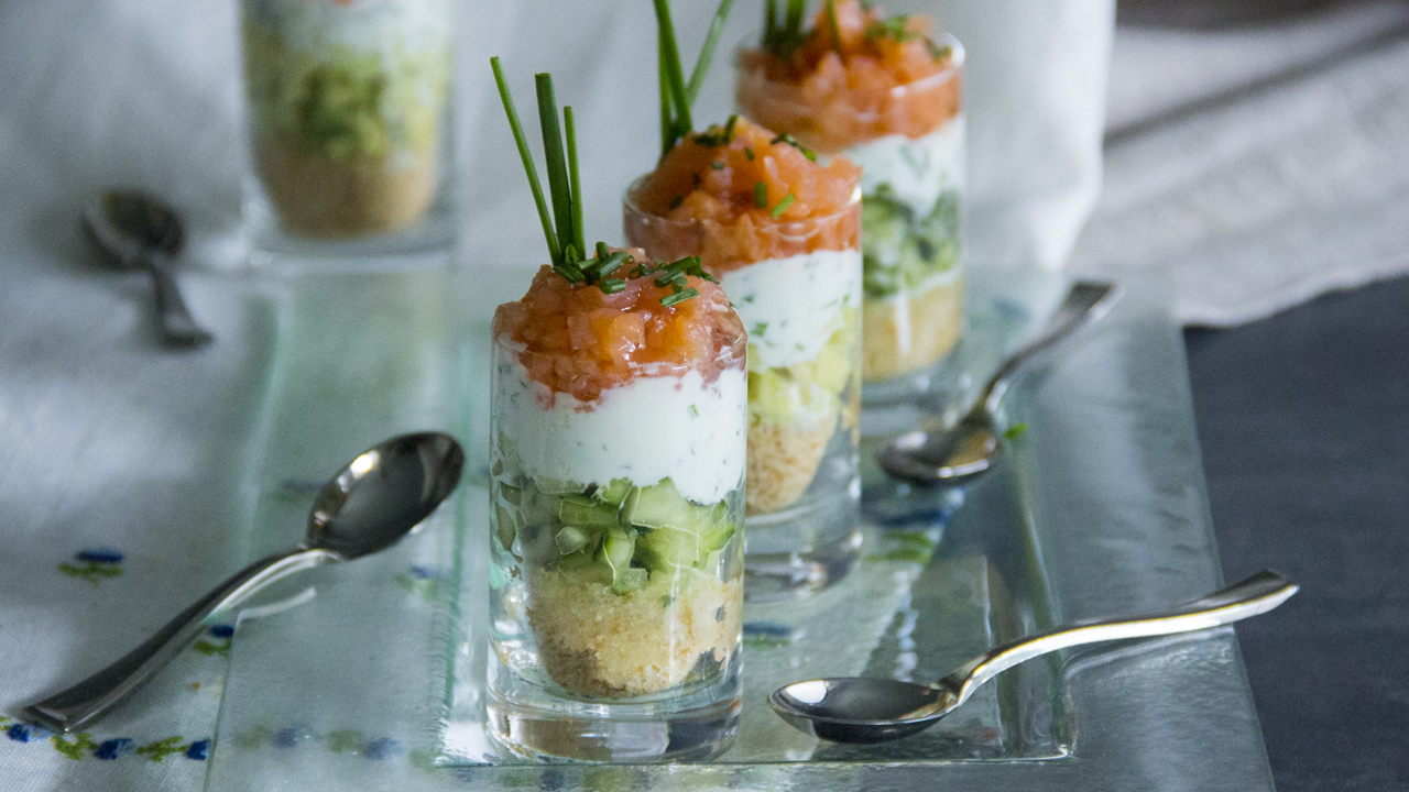 Hoy os traigo un aperitivo en vasito con salmón ahumado y una riquísima salsa de yogur con cebollino… elegante y