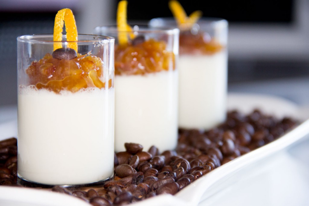 O lo que es lo mismo, Panna (nata) Cotta (cocida) infusionada con aromas de café y naranja. Una receta que funde en nuestro paladar los dos intensos sabores del café y la naranja en un postre único.