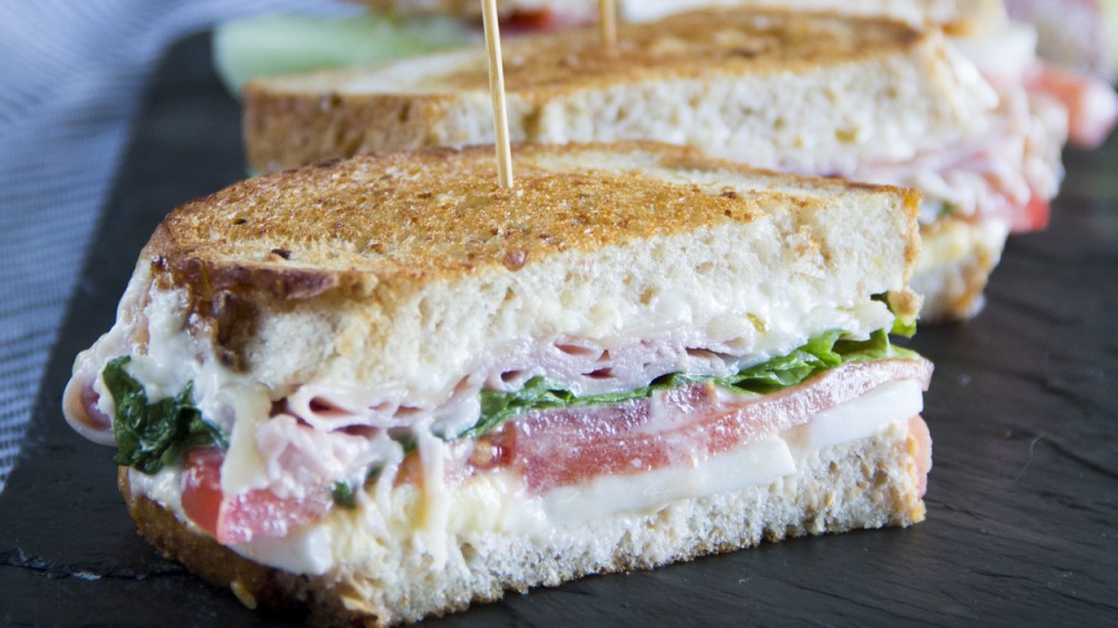 Con todos estos ingredientes, a la plancha con mantequilla este sandwich está de escándalo, y lo podéis cortar así en triángulo o rectángulo.