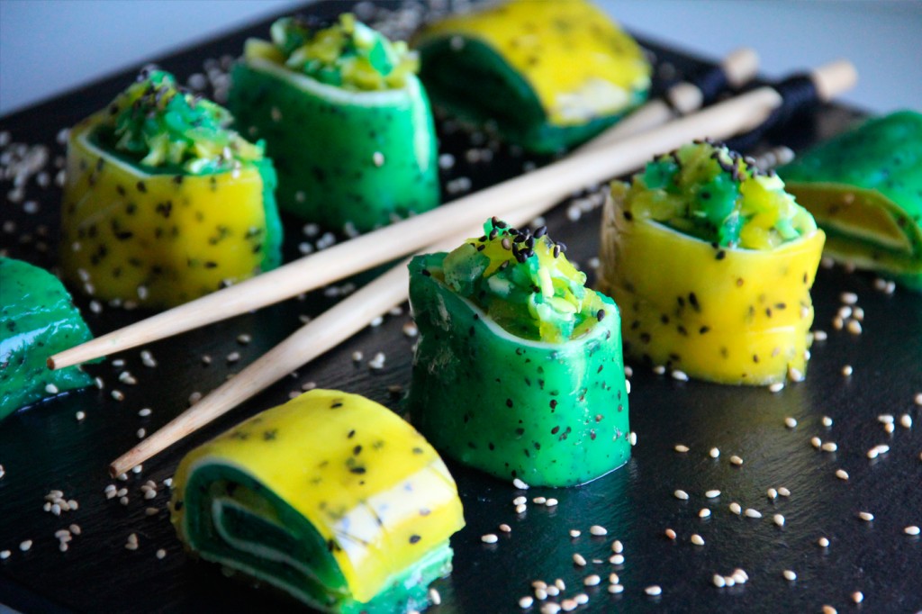 Un espectacular sushi de frutas naturales con piña, kiwi y leche de coco. Una receta sencilla: triturar, licuar, hervir y enfriar, con un toque dulce muy rico y un punto delicado sólo cuando vamos a enrollar, cortar y emplatar.