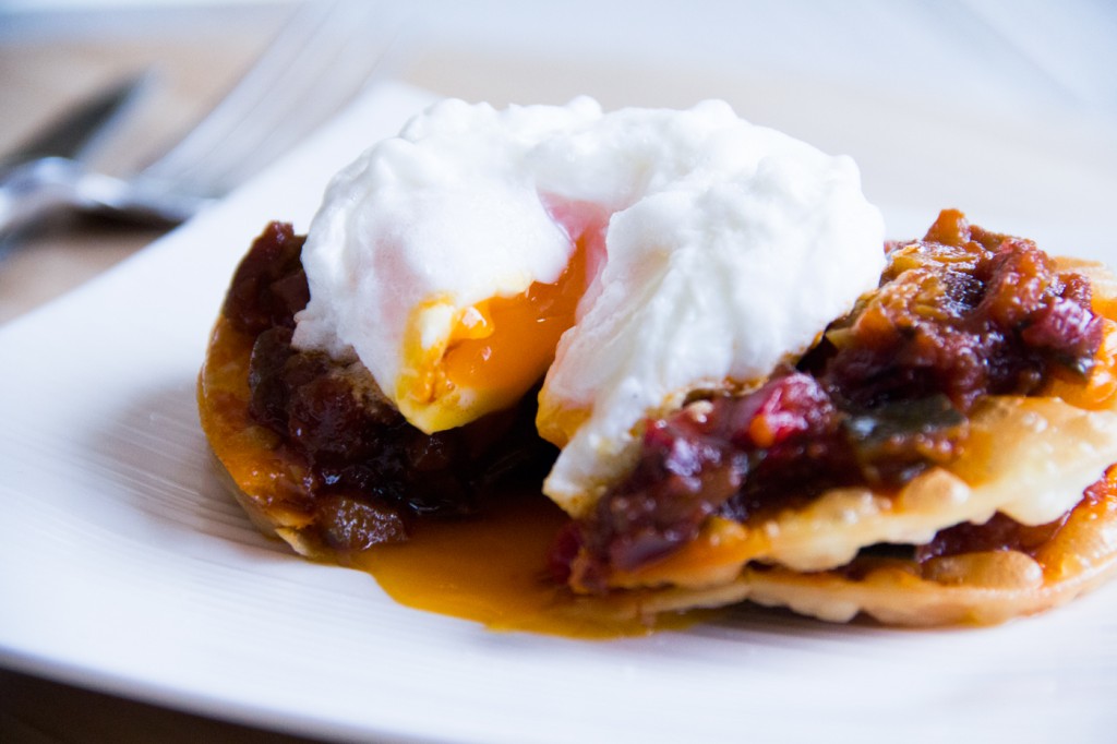 En vez de tartaletas se acompañaba con pan frito, y en vez de con huevo escalfado se cocinaba con los huevos cuajados.
