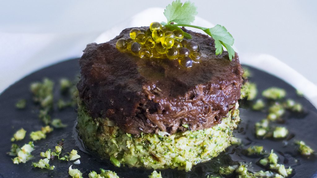 Con un aro de emplatar que se llama timbal, por ello el nombre, ponemos el brócoli, las carrilleras, la salsa, este caviar de aceite de oliva virgen extra y decoramos con una ramita de cilantro o la que tengáis.