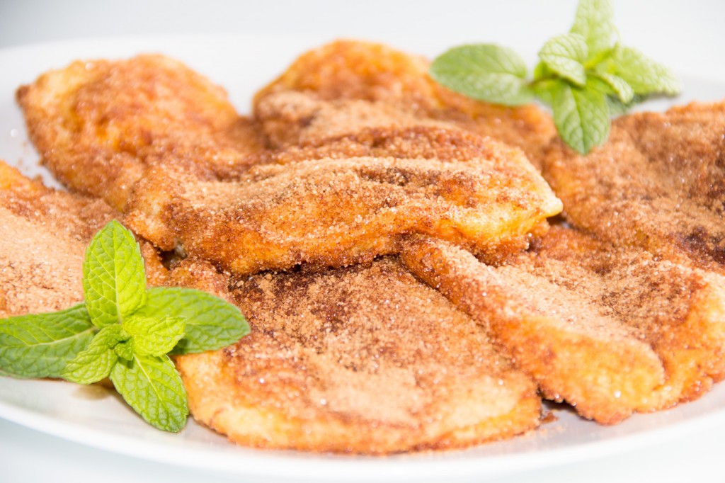 El plato de las torrijas o tostadas de Carnaval puede ir decorado con una hojitas de menta o hierbabuena y con unas grosellas.