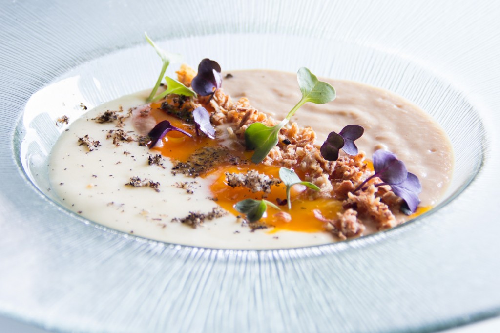 Acabamos poniendo un poco de cebolla frita crujiente alrededor de las yemas. Rallamos trufa sobre la emulsión de patata y añadimos unos brotes de rábano sango introduciendo el tallo dentro de la emulsión y natilla.